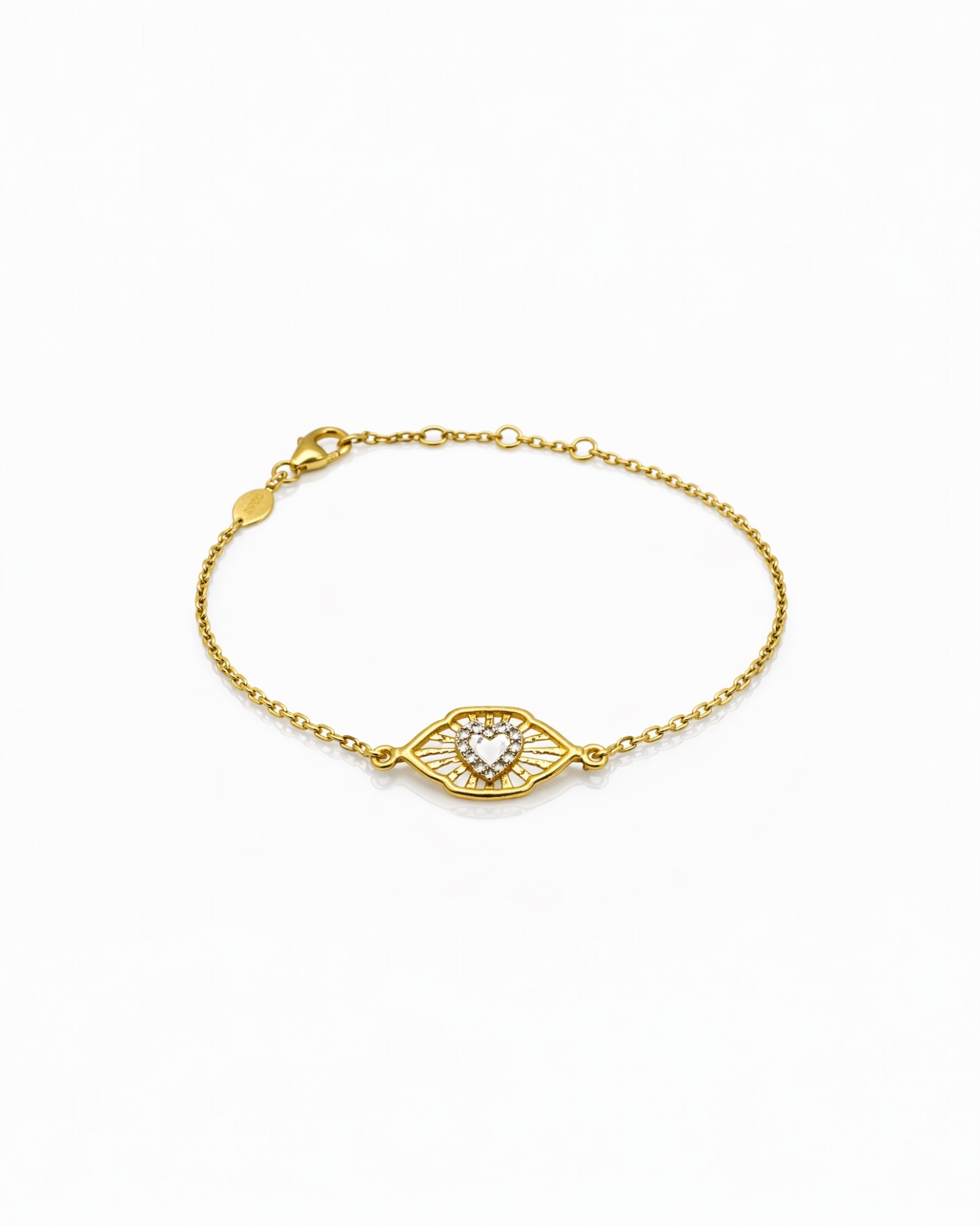 Bracelet coeur Agapé en vermeil 18 carats guilloché serti de saphirs blancs. Proposé sur une chaîne en vermeil ajustable.